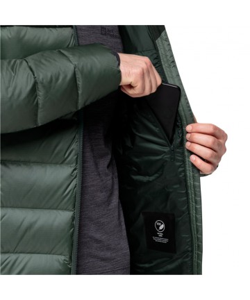 Exteriorul este croit din tesatura PERTEX QUANTUM robusta, rezistenta la vânt, fabricata din poliamidă reciclată, iar umplutura este realizată cu puf certificat RDS, cu putere de umplere ridicată.
