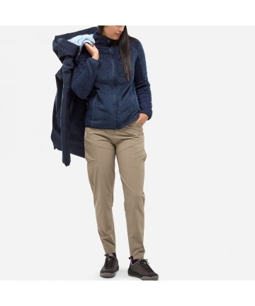 Ideală pentru purtare zilnică, este perfectă pentru a fi purtată la poalele traseelor de alpinism. În timp ce asiguri partenerul, fleece-ul moale, cu fir lung, oferă exact cantitatea potrivită de căldură, iar panourile elastice de sub brațe și în partea inferioară a spatelui asigură libertate completă de mișcare pentru a manipula coarda cu ușurință. Hamul se așează confortabil peste zona de protecție din spate.
